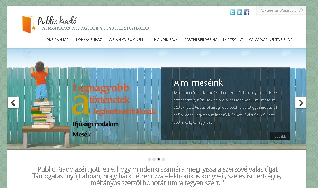 A Publio.hu oldalon található szolgáltatás mindenki számára lehetőséget ad arra, hogy többféle formátumban is megjelentesse saját elektronikus könyvét, terjessze itthon vagy külföldön, sőt azt később nyomtatott formában is viszontlássa. A portál fejlesztői eszközt kínálnak az alapszintű formázási feladatok megoldására, és az elkészült elektronikus könyvek a világ legnagyobb könyváruházaiba automatikusan felkerülnek.