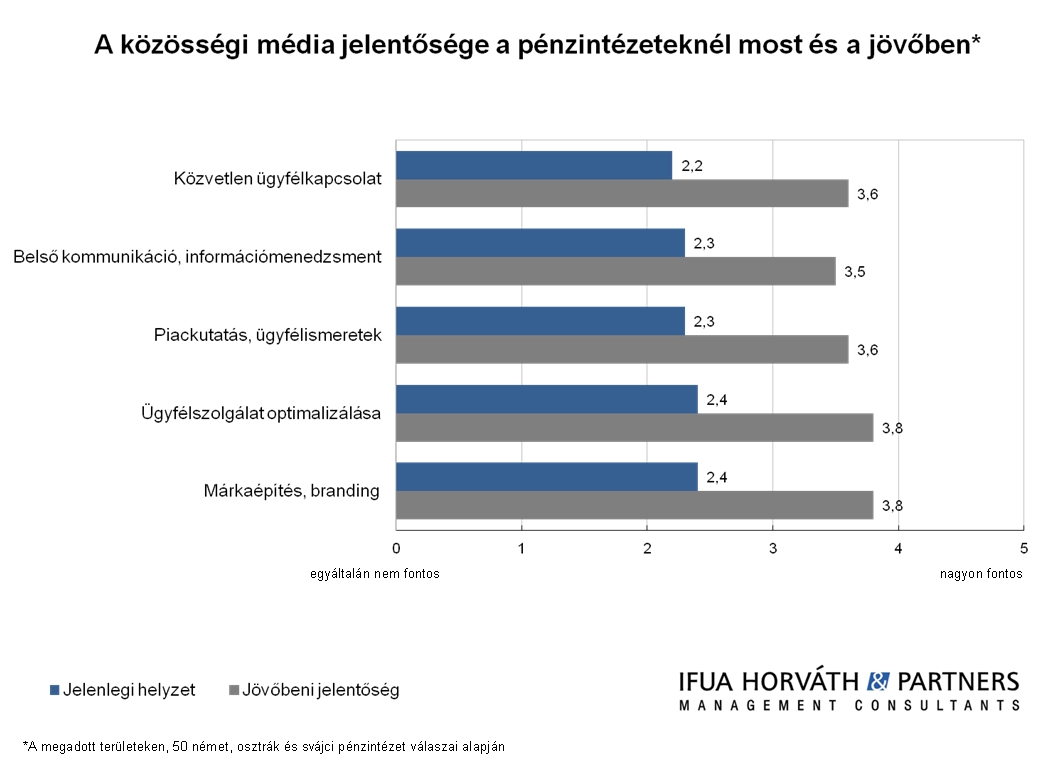 A vállalatirányítási tanácsadással foglalkozó nemzetközi cég 50 bankot, biztosítót és más pénzügyi szolgáltatót kérdezett meg az értékesítés gyakorlatáról Németországban, Ausztriában és Svájcban. A válaszok feltűnően nagy különbséget mutattak a közösségi média jelenlegi használata és aközött, hogy milyen nagy jelentőséget kívánnak adni a jövőben a Facebooknak, a Twitternek és társaiknak.