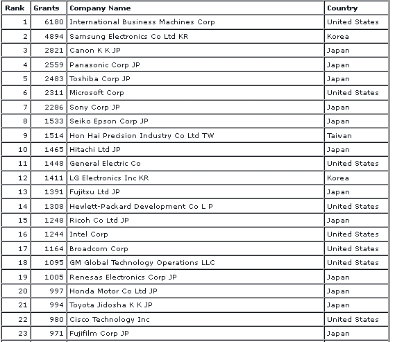 EZ az a RANGLISTA, amelyen a Xerox és a Fuji-Xerox lentebb van ugyan, de együtt jegyzett 1618 szabadalmával a 8-iknak számít.