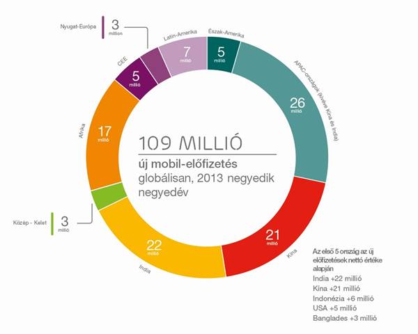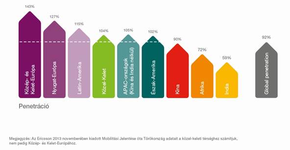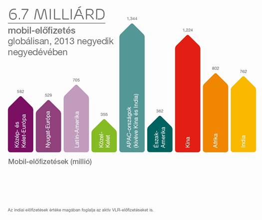 2013 negyedik negyedévében a globális mobilpenetráció 92%-os volt A további fontos növekedési adatok közül néhány: