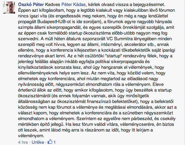 „Ami pedig Péter Kádas által a múlt heti VC Summiton elhangzott előadást illeti, szerintem másképp éltük meg a dolgokat. A legkevésbé sem akartam vitatkozni róla, ezért nem is idéztem szó szerint az ott elhangzottakat, de fogadd el, hogy mindenkiben az a benyomás maradt, miszerint általában minősítetted a befektetőket, még ha valóban egy idézet alapján is tetted. Az evidencia, hogy egy befektetését bedöntő befektető seggfej, de nem minden befektető ilyen, s az előadást megelőző beszélgetésünkben épp azt kértem, hogy kerüljük az általános minősítéseket, mert azok nem építő párbeszédekhez, hanem elmérgesedő vitákhoz vezetnek. Ezzel együtt semmi bajom egyébként még az ilyen mértékű provokációkkal, azok akár életet is vihetnek egy vitába. Csakhogy én pillanatnyilag nem azt látom a hazai startup világ problémájának, hogy a befektetők seggfejek, sokkal inkább azt, hogy anélkül seggfejezik le őket, hogy bárki a saját háza táján tudná a megfelelő eredményeket felmutatni.Ma nem az a helyzet a hazai piacon, hogy egy alulfejlett befektetői szektor nem tudja finanszírozni a tömegével szárba szökkenő új vállalkozásokat, hanem épp ellenkezőleg, egy túlfinanszírozott, túltőkésített kockázati tőke iparág nem talál magának megfelelő befektetési célpontokat és sokszor olyan projekteket is finanszíroz, akár kényszerből, akár más megfontolásból, akik a világ más táján soha nem jutnának finanszírozáshoz. Ehhez képest az a körülmény, hogy egyes akcelerátorok nem azt tekintik feladatuknak, hogy tapasztalatlan, kezdő vállalkozókat alkalmassá tegyenek befektetések fogadására, hanem azt, hogy ostorozzák a befektetőket, hogy még inkább becsukott szemmel boldog-boldogtalannak adjanak pénzt és ne foglalkozzanak vele, ha bedőlnek a projektjeik, kifejezetten szerencsétlen tendenciának tartom. Mindezt pedig tovább fokozza az állami szektor viselkedése, aki érthetetlen politikai motivációval az ésszerűnél sokkal több pénzt szórt a kockázati tőkealapokba, miközben semmivel nem finanszírozza az inkubációs folyamatokat (illetve csinált egy olyan Gazella pályázatot, aminek az lett az eredménye, hogy több inkubátor zárt be, mint amennyi elindult, de végül a nyertesek sem tudtak érdemi tevékenységbe kezdeni), ez mind maga már a kaffkai abszurditás. Így nyilván nem lesznek szaporodó sikervállalkozások, csak több irányú piszkálása a kockázati tőke szektornak, hogy miért nem fektet be még meggondolatlanabbul, hiszen a politikának nem érdekes a 3-5 éves lefutású infrastruktúra építés, hanem mindenből fél-egy év alatt akar eladható propaganda anyagot csinálni. A múlt heti konferencián épp ezt mondtam el: hogy ha ezeket a tendenciákat tartjuk, akkor pár éven belül Magyarország ismét a lehető legrosszabbul elköltött állami pénz és a legtöbb bedőlő befektetés rekordját fogja felállítani, most épp a startup és kockázati tőke szektorban. Ha nem sikerül néhány meghatározó szereplőt legalább elgondolkodtatni a folyamatokról és kis, szükséges iránymódosításra rávenni, akkor könnyen lehet, hogy ebbe a szektorba is össze lehet hozni olyan átmeneti látszatsikereket, mint mondjuk korábban a lakáshitelezésben, amit aztán akkora összeroppanás követ, hogy évekig fogjuk nyögni, intézményi befektető be nem teszi majd a lábát a magyar kockázati tőkepiacra, az elszenvedett veszteségek miatt állami pénz sem marad, a még életben maradt startupok pedig csoportostul és egységesen menekülnek majd külföldre. Nekünk a magunk részéről megvannak a válaszaink ezekre a problémákra, jól tudunk együttműködni a startup cégekkel és megoldjuk azokat a problémákat, amiket pl. az államnak kéne megoldania, de egyelőre nem tesz meg, vagy inkább olykor fokozza is a problémákat. De attól, mert mi jól megvagyunk, a befektetéseink jól állnak és ígéretes jövő elé néznek, a szektor még számos problémával küzd, amit ideje elkezdeni kitárgyalni, mert sem mi, sem más nem fogja tudni mentesíteni magát attól, ha a folyamatok egy óriási kipukkadásba torkollanak. Szívesen elmondtam volna az ezzel kapcsolatos meglátásaimat akár a csütörtöki, akár más rendezvényen, nem szoktam megijedni a szerepléstől. Ezek a problémafelvetések azonban úgy tűnik, egyelőre nem passzolnak a jelenlegi divattendenciákhoz és sikerpropaganda irányokhoz, így majd kénytelen leszek magam megtalálni az elérhető vitafórumokat.”