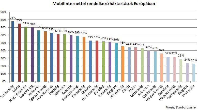 Magyarországon rendkívül alacsony azon háztartások száma, amelyek mobilinternettel rendelkeznek. Míg az Európai Unió tagállamaiban a lakosság 52 százaléka használ mobilinternetet, addig Magyarországon ez a szám Romániához hasonlóan csupán 32 százalék. Egyedül Portugália (23%), Bulgária (24%) és Görögország (29%) marad el hazánktól. Ennek oka, hogy a magyarok még mindig az olcsóbb kábeles internethasználatot részesítik előnyben. A legtöbb uniós tagállamban a kábeles szolgáltatást használó háztartások aránya 20-30 százalék körül mozog, hazánkban viszont három háztartásból kettő még mindig k ábeles hálózatot használ – adta hírül az Internetet.hu távközlési összehasonlító portál.