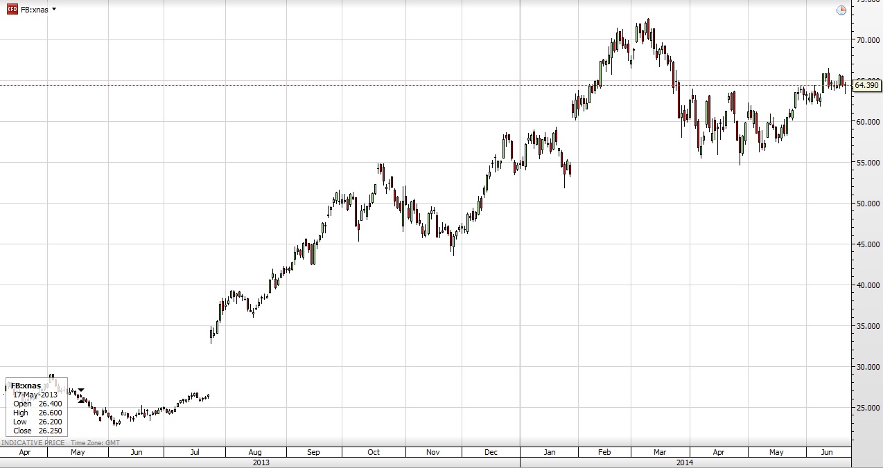 A Facebook első negyedéves eredménye nem véletlenül nyűgözte le a befektetőket: az elmúlt 12 hónap során a reklámbevétel 82 százalékos növekedése hároméves rekordot döntött, míg a havi aktív felhasználók száma 1,11 milliárdról 1,28 milliárdra ugrott. Eközben a cég EBITDA-mutatóját 42,1 százalékról 53,5 százalékra emelte, amely bizonyítja, hogy a Facebook nemcsak a bevételek növekedésével, hanem az alapok erősítésével, a működési költségek folyamatos ésszerűsítésével is törődik. Az elmúlt év során 170 százalékot erősödő Facebook-részvény (árfolyama alább) ezzel a Saxo Bank toplistájának élére került, 21 százalékos 12 hónapra előre vetített hozamvárakozással.