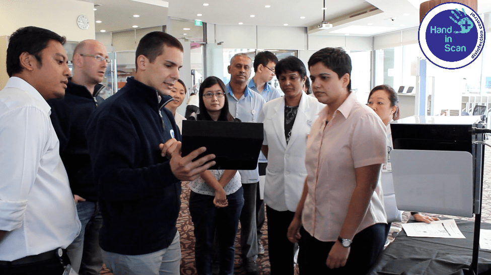 A Hand-in-Scan forradalmi technológiája egy speciális kézfertőtlenítőszer használata után megméri a kézmosás hatékonyságát és azonnali, objektív visszajelzést ad a felhasználónak.