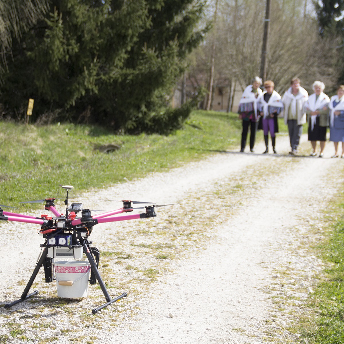 A lendvajakabfai asszonyok először meglepődtek, amikor a levegőből érkező „locsodrón” nemcsak vízzel öntözte meg őket, de egy férfihang még jókívánságokat is tolmácsolt az ország különböző részeiből.