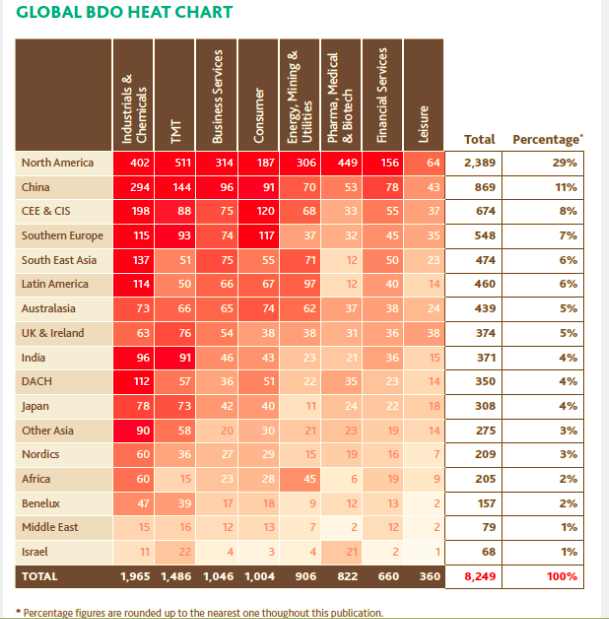 A vállalati felvásárlási folyamatok jelentős része az 500 millió dollár alatti, úgynevezett közepes méretű tranzakciók területén zajlik, ezért a teljes piac mozgását is alapvetően ez a szegmens határozza meg. Miközben a több milliárd dolláros nagyságrendű tranzakciókra alapvetően befektetési bankok specializálódtak, a nagy könyvvizsgáló/tanácsadó cégek klasszikus területe a mid-market M&A piac, amelynek egyik vezető szereplője a BDO (tavaly 219 tranzakcióban vett részt pénzügyi tanácsadóként ebben a szegmensben).