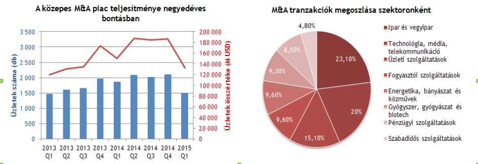 A felvásárlási tranzakciók 23 százalékára az ipar és vegyipari szektorban került sor, 20 százalékkal részesedett a TMT (technológia, média, telekommunikáció), míg 15 százalékkal az üzleti szolgáltatások szektora. A magántőke alapú kivásárlások száma egy év alatt 29 százalékkal, 241-ről 170-re csökkent.