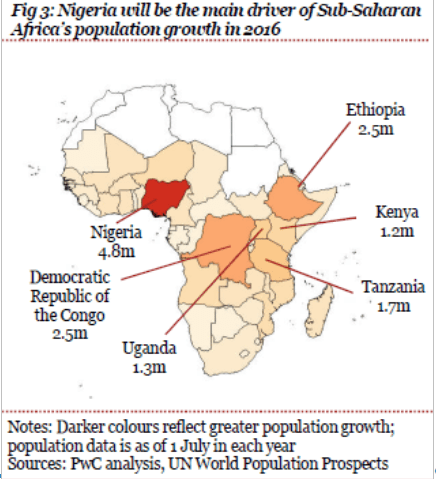 Afrika Szaharától délre fekvő területei Ausztrália lakosságának megfelelő lélekszámmal növelik a világ népességét: Afrika Szaharától délre fekvő területeinek népessége 2016-ban több mint 25 millió fővel, vagyis Ausztrália teljes lakosságától magasabb lélekszámmal nő. Ez megfelel ez elmúlt időszakok trendjeinek, mivel ezeknek a területeknek a lakossága 2006 óta minden évben több mint 20 millió fővel nőtt. A 3. ábrán látható, hogy országokra lebontva a Szaharától délre fekvő területek 2016. évi népességnövekedéséből Nigéria önmagában majdnem 20%-ot képvisel.