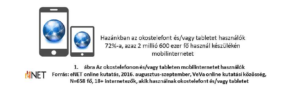 Az eNET 2016 augusztus-szeptemberében végzett online kutatása alapján okostelefont már a felnőtt magyar internetezők kétharmada, tabletet pedig negyede használ. Okostelefonján és/vagy tabletjén wifit 98% (több mint 3 és félmillió ember), mobilnetet pedig már 72% használ (azaz 2 millió 600 ezren). A mobilnet-előfizetők körében a 4G szolgáltatással rendelkezők aránya már eléri a 62%-ot.