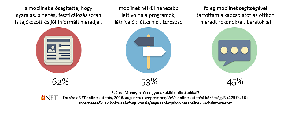 A mobilnetet használók mára hozzászoktak az általa nyújtott előnyökhöz, különösen informálódásban és kapcsolattartásban tartják kulcsfontosságúnak. Nem volt ez persze másképp nyáron sem: 62% szerint a mobilinternet elősegítette, hogy nyaralás, pihenés, fesztiválozás során is tájékozott és jól informált maradjon; több mint felük szerint e nélkül sokkal nehezebb lett volna a programok, látnivalók, éttermek keresése; 45% pedig főleg mobilnet segítségével tartotta a kapcsolatot az otthon maradt rokonaival, barátaival, ismerőseivel.
