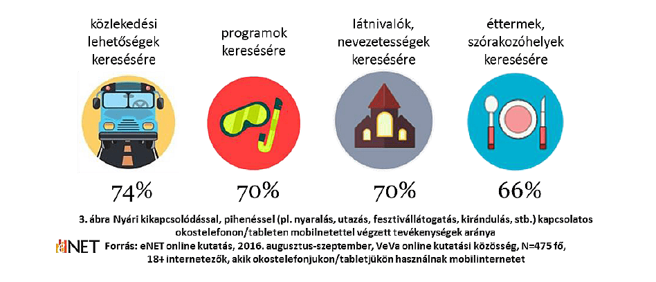 Nyári kikapcsolódás, pihenés (pl. nyaralás, utazás, fesztivállátogatás, kirándulás) során már egyértelműen az információkeresésé volt a főszerep: okostelefonon és/vagy tableten mobilnetet a legnagyobb arányban közlekedési lehetőségek keresésére (74%); programok, valamint látnivalók, nevezetességek keresésére (egyaránt 70%); és éttermek, szórakozóhelyek keresésére (66%) használtunk.