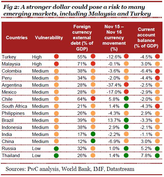 A dollár hazaáramlásának hatása: Az amerikai monetáris politika szigorítása bátoríthatja a dollár fokozatos repatriálását. A 2. sz. ábrán látható kockázati mátrixunk azt mutatja, hogy Malajzia, Törökország és Chile különösen kitett ennek a kockázatnak, mivel devizaadósság-állományuk GDP-jük 71%, 64%, illetve 55%-át teszi ki. Az ezekben a gazdaságokban kitettséggel rendelkező, nem kellően tőkésített bankokra nyomás nehezedik majd. Ugyanakkor egyes nyersanyagoktól függő gazdaságokban, mint például Brazíliában és Oroszországban a várhatóan emelkedő olaj- és egyéb nyersanyagárak egy rugalmas árfolyam-politikával ötvözve enyhíthetik az Egyesült Államok felé visszairányuló tőkeáramlás hatását.