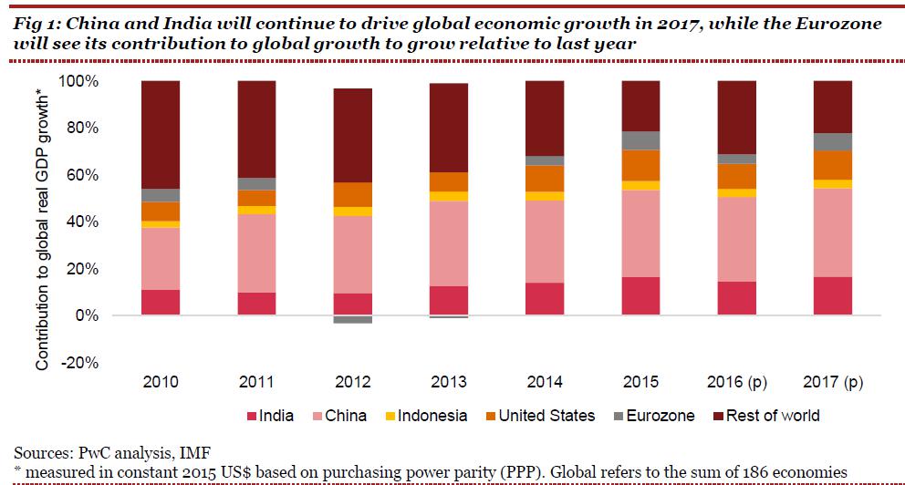 Az E7 országok közül India növekedése lesz a legnagyobb (7,5%), míg a kínai növekedés évi 6,5%-ra lassul. Tavaly az indiai gazdasági növekedés mértéke 7,6%, míg a kínai 6,6% volt.
