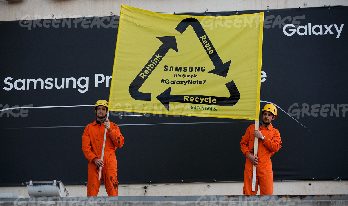 A Samsung 4,3 millió Galaxy Note 7 készüléket hívott vissza 2016-ban, mert a telefonok felrobbantak, kigyulladtak. A cég azonban máig nem hozta nyilvánosságra, mit kezd a visszahívott készülékkel. A Greenpeace úgy véli, a készülékek visszahívásának oka, hogy a telefonokat pazarló és fenntarthatatlan módon gyártják, mellyel a bolygónkra is hatalmas környezeti terheket rónak. Amennyiben a Samsung valóban igyekszik elkerülni az ehhez hasonló eseteket a jövőben, egy olyan rendszer felé kell elmozdulnia, amely megkönnyíti a telefonok javítását, újrahasználatát és újrahasznosítását, példát mutatva ezzel az egész IT-szektornak.