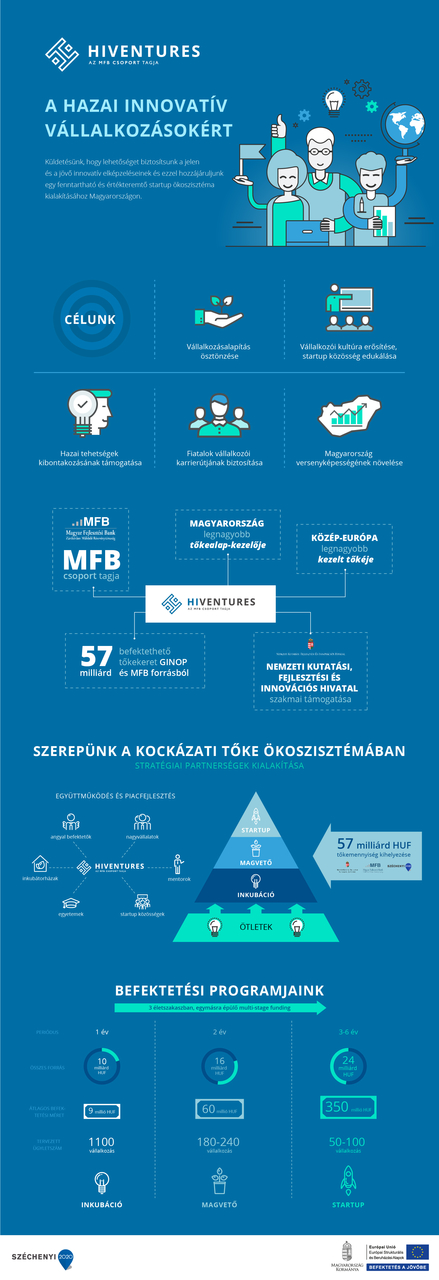 A Hiventures az MFB Csoporthoz tartozó, állami tulajdonú kockázati tőketársaság, amely Európai Uniós és saját forrásból, a mikro-, kis- és középvállalkozásokba történő tőkebefektetéseivel lefedi a fejlesztéspolitikai szempontból releváns inkubációs, magvető és korai (startup) befektetési fázisokat, hozzájárulva a nemzetgazdasági teljesítmény növeléséhez. A Hiventures tevékenységét a Nemzeti Kutatási, Fejlesztési és Innovációs Hivatal, valamint a Magyar Fejlesztési Bank Zrt. támogatja szakmailag.