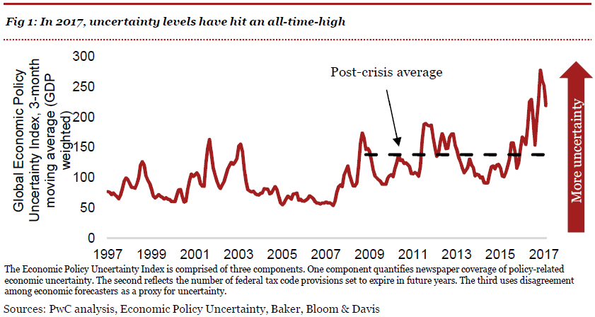 A PwC legújabb Global Economy Watch kiadványa szerint a jelenlegi politikai és gazdasági környezetben évtizedek óta nem látott szintre emelkedett a bizonytalanság.