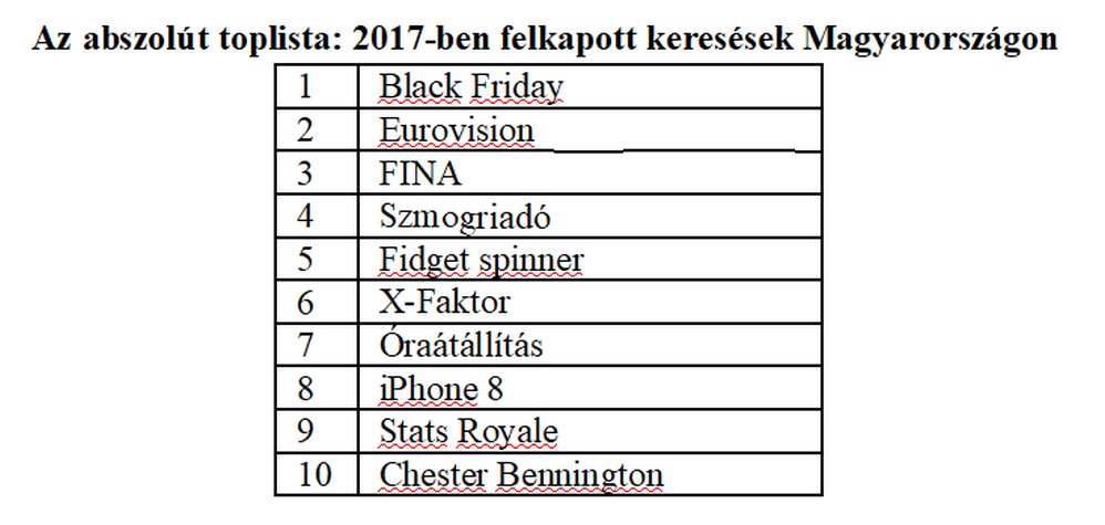 Az év sporteseményei, a FINA és az Andorra – Magyarország futballmérkőzés mellett a Black Friday, az Eurovíziós Dalfesztivál és a Fidget spinner szerepeltek a Google magyarországi keresési toplistájának élén, de az óraátállítás és a csirkemell recept is előkelő helyen végeztek. Az idén tizenhetedik alkalommal publikált lista az év legnépszerűbb kereséseit sorakoztatja fel, több mint 70 ország többszáz toplistáját ismertetve, többféle tematika szerint, úgy, mint kultúra, sport, mozifilmek, tévéműsorok és a legkeresettebb receptek.