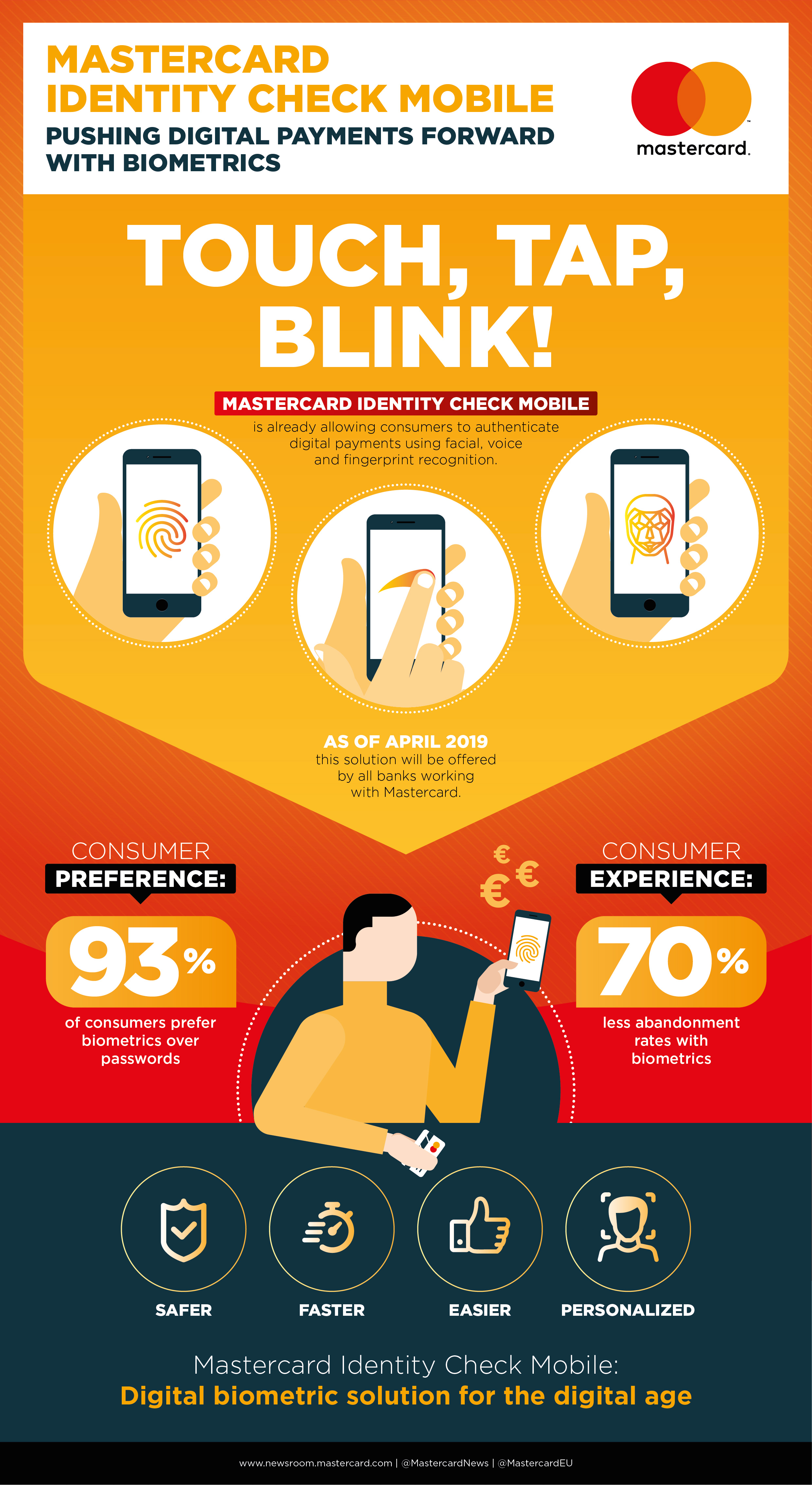 A Mastercard bejelentette, hogy 2019 áprilisától Magyarországon is elérhetővé teszi a vásárlók számára a biometrikus, így többek között az arcfelismeréssel vagy ujjlenyomattal történő hitelesítést.