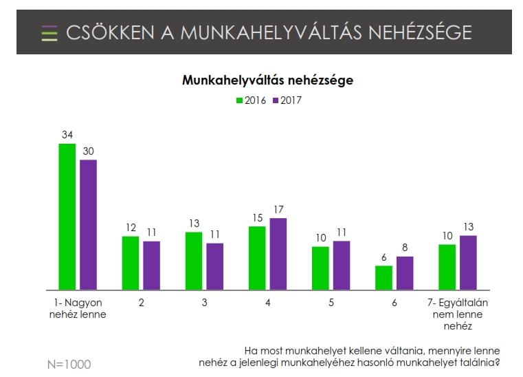A munkáltatók között zajló egyre kiélezettebb harcot tükrözi az a tény is, hogy a munkavállalók egyre kevésbé érzékelnek nehéznek egy esetleges váltást. A megkérdezettek 13 százaléka szerint egyáltalán nem lenne nehéz a jelenlegihez hasonló munkahelyet találnia, de legkevesebb 32 százalékuk is az optimistább tábort erősíti. A 2016-os adatokkal összehasonlítva ez 6 százalékos növekedést jelent, ami igen jelentős változás mindössze egy év alatt.