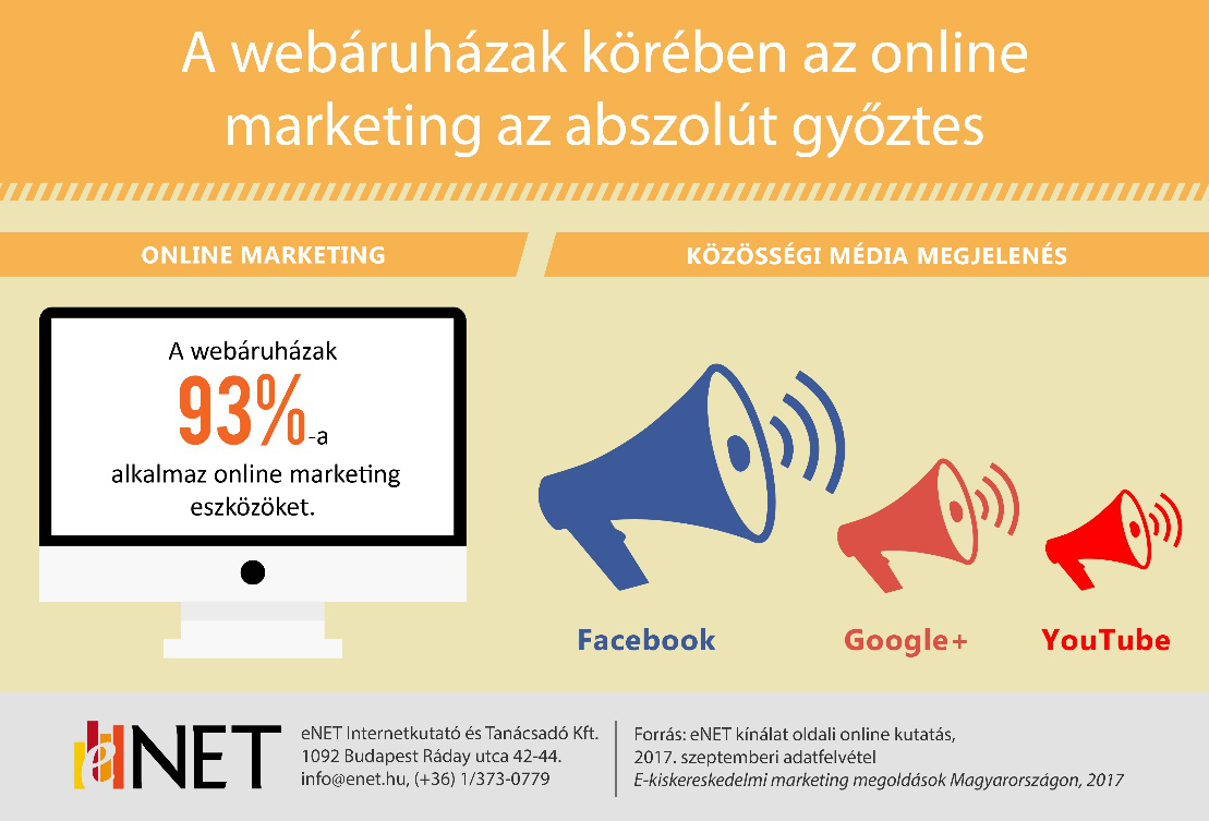 A keresőoptimalizálás és a fizetett hirdetések a favoritok az online marketing eszközök közül. Nemcsak a legnagyobb arányban használják ezeket, hanem a leghatékonyabbnak is bizonyulnak a webáruházak szerint. A közösségi médiában való megjelenés már szinte alapvető, és tízből nyolc webáruház van jelen a Facebookon. Az évben pedig továbbra is a karácsony és a Black Friday időszakában indít marketing kampányt a legtöbb webáruház – derül ki az eNET webáruházak marketingtevékenységét vizsgáló kutatásából.