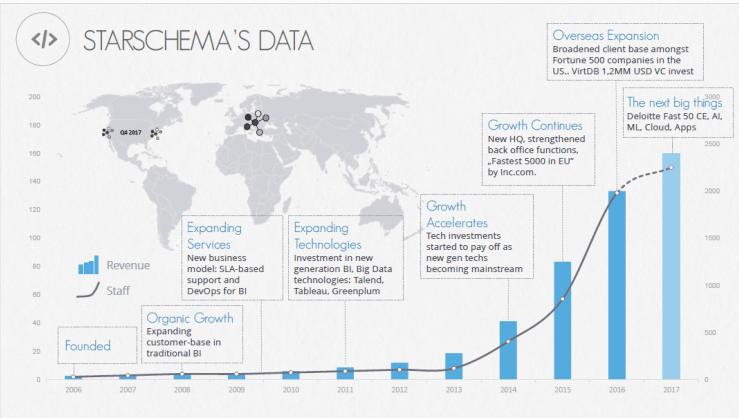 A hazai Big Data történelmében kétségtelenül kiemelt szerepet játszik a Starschema. A Big Data, Business Intelligence, adatvirtualizáció és adattárház fejlesztés és tanácsadás területén tevékenykedő csapat a magyar piacon kategóriájában piacvezető, árbevételüket 2011 óta minden évben közel megduplázták, majd 2017-ben elérték a közel 10 millió USD-t.