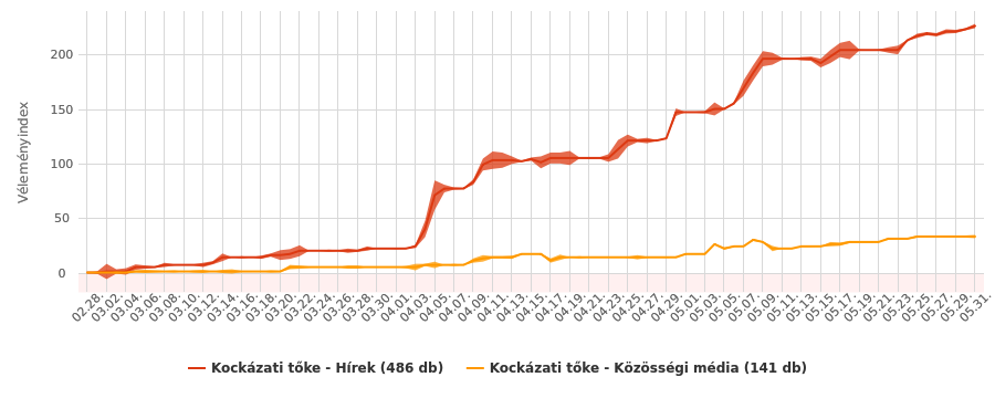 A sajtóban relatíve gyakran szólt a fáma újonnan köttetett partnerségről tőkebefektetők és feltörekvő startupperek között, megduplázódott bevételről a kockázati tőkebefektetésnek köszönhetően (a Nanushka nagy örömére), és sosem látott összegek beruházásáról pl. az AI szektorban. Az „Évtizedes csúcson a kockázati tőke” és „Összefog a Microsoft és a Hiventures a magyar startupok jövőjéért” szalagcímek már előrevetítik, hogy bár főleg a sajtóban, de összességében és a social media véleményekben külön is a pozitív említések kerültek fölénybe, így a téma megítélése a vizsgált időszakban végig pozitív és felfelé ívelő maradt.