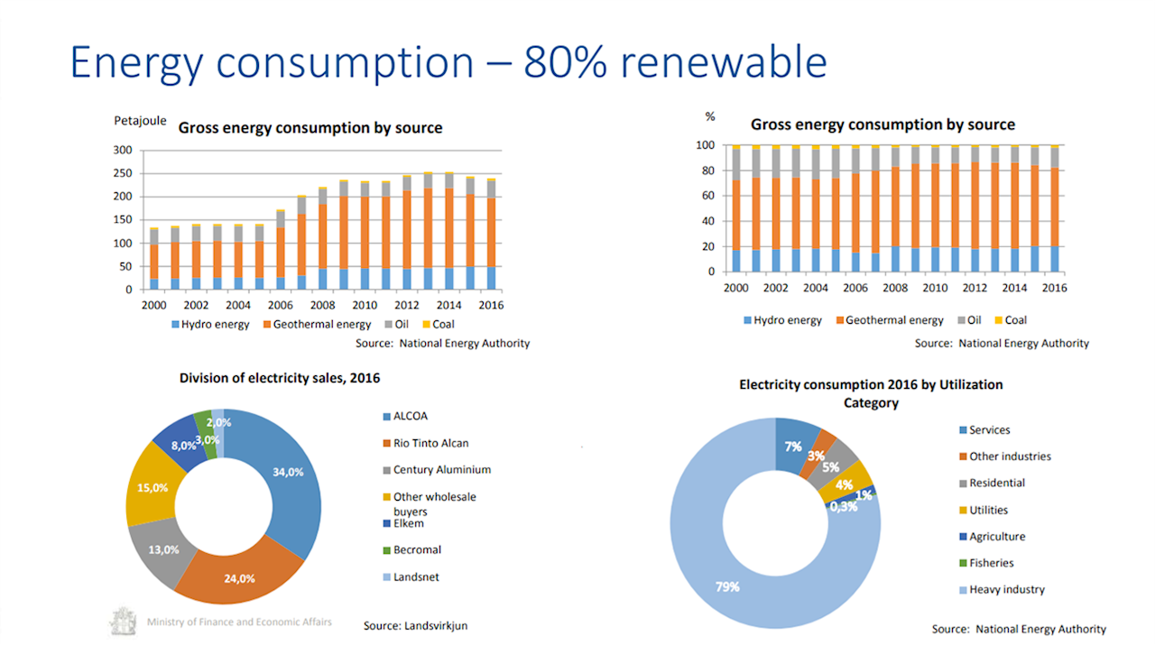Az izlandi fenntarthatósági programnak az a felismerés adott lendületet, hogy a szigetország túlzott mértékben függött a külföldi olajforrásoktól. Napjainkban az izlandi energiafogyasztás 80%-át nem fosszilis energiaforrásokból fedezik, hanem főként víz- és geotermikus energiával.