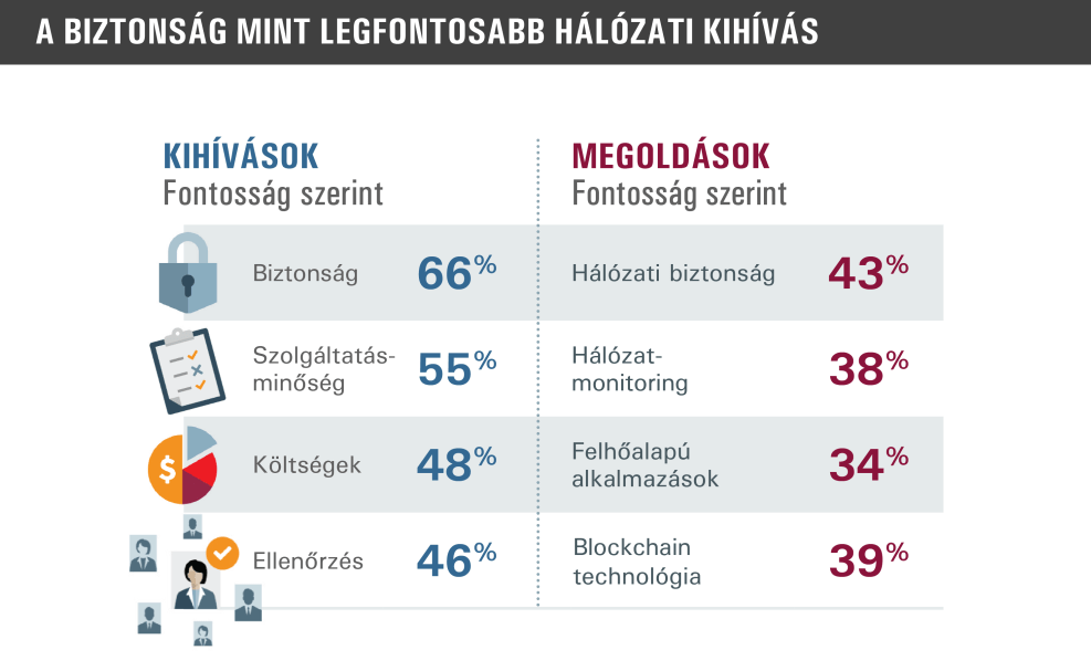 Új technológiák, mint lehetséges megoldások: A válaszadók 76 százaléka egyetértett azzal, hogy új megoldásokra van szükség ahhoz, hogy fejleszteni tudják a teljes hálózatuk feletti ellenőrzést. A válaszadók 69 százaléka megjegyezte, hogy biometrikus rendszereket, míg 57 százalék mesterséges intelligenciát (AI) fog alkalmazni a hálózatbiztonsági esetek kezelésére. Ezzel párhuzamosan az AI-t és a gépi tanulást is kulcsfontosságú technológiákként határozták meg a szolgáltatás-minőség és költséghatékonyság támogatása terén (30%-30%), míg a blockchain technológiát a válaszadók 27 százaléka jelölte meg legfontosabb technológiaként a hálózati ellenőrzés fejlesztésére.