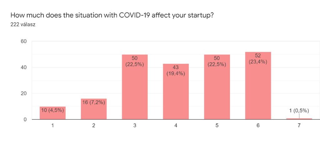 Arra kértük a startupokat, hogy 1-től 6-os skálán értékeljék, milyen mértékben érinti a koronavírus a vállalkozásukat. Az 1-es érték azt jelentette, hogy egyáltalán nem érinti, a 6-os azt, hogy a vállalkozás túlélését veszélyezteti. Azt láthatjuk az eredményekből, hogy a legtöbb startup inkább fél attól, hogy túlélik-e a krízist.