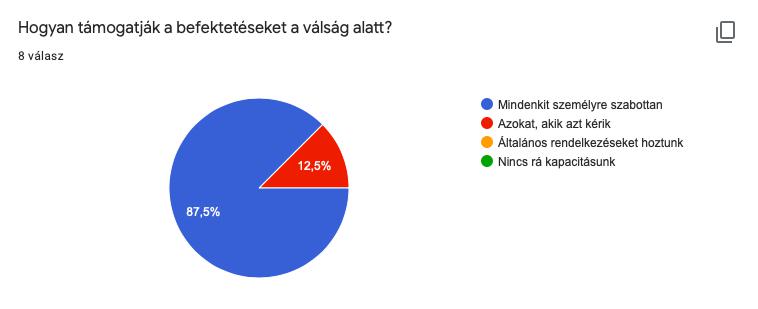 Kíváncsiak voltunk, hogyan támogatják a befektetéseket a válság alatt. 89%uk úgy nyilatkozott: biztosította, hogy befektetései személyes, személyre szabott támogatási tervet kapjanak a túlélés érdekében. A maradék 11% azt válaszolta: csak azoknak nyújt segítséget, akik ezt kifejezetten kérték.