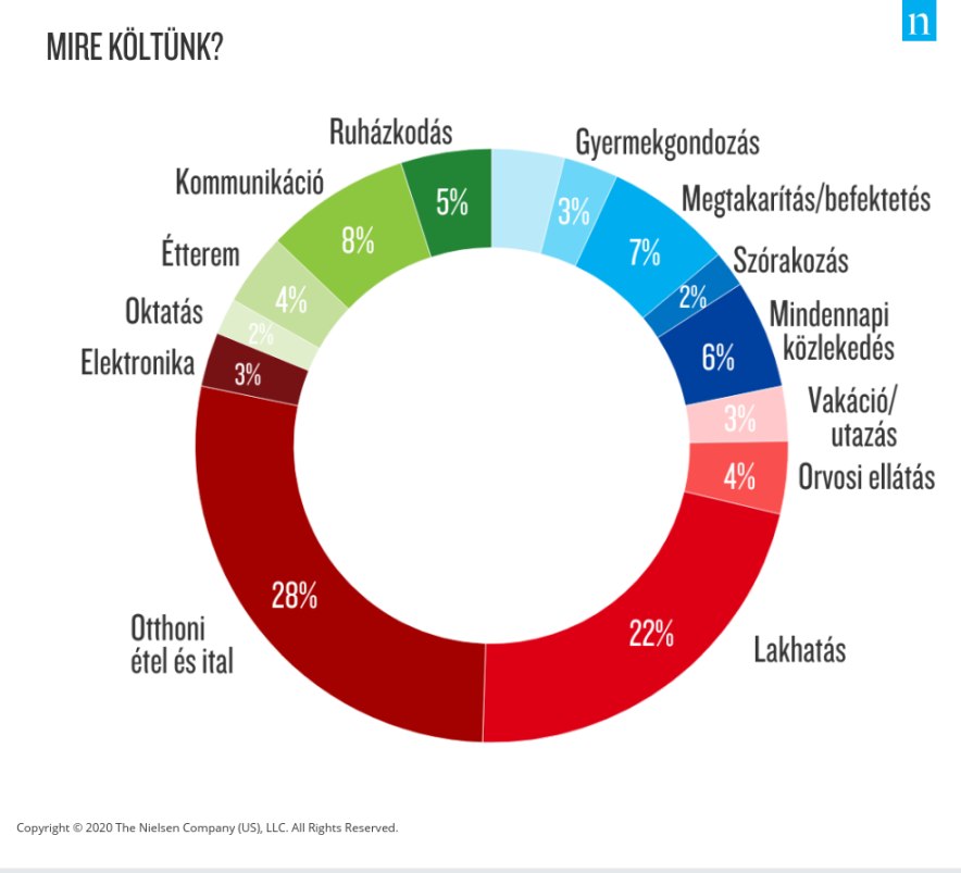 A magyarok rendelkezésére álló havi keretéből közel 30% otthoni étkezésre megy el, 22% pedig lakhatásra (albérlet, lakáshitel, rezsi; stb.), míg kommunikációs költségekre (mobil, internet, tévé; stb.) pedig a havi büdzsé 8 százalékát költjük.