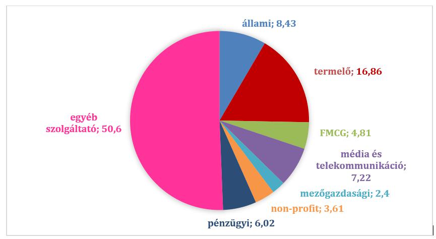 Online kérdőívünket összesen 86 fő töltötte ki. Sok szegmensből érkeztek válaszok. A legnagyobb mértékben a szolgáltató szektorból (egyéb szolgáltató: 50,6% + pénzügyi szolgáltató: 6,02%), a második legtöbb kitöltés pedig a termelő vállalatok területéről érkezett (16,86%).