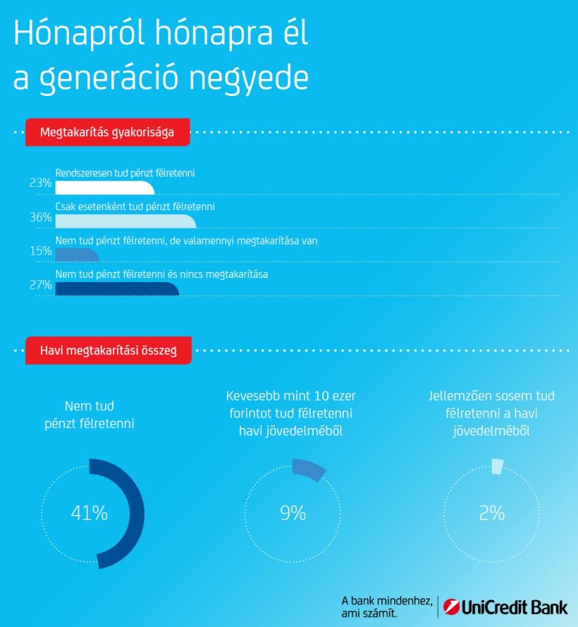 Az öngondoskodás és megtakarítás erősen összefügg a generáció pénzügyi tudatosságának erősödésével – saját bevallásuk szerint kivétel nélkül mindenki igyekszik megtakarítani, és negyvenes éveire megalapozni az anyagi biztonságot, a kutatás számai ezzel szemben megdöbbentők. A 30-as generációnak csupán a 23%-a tud rendszeresen félretenni, egyharmada csak esetenként tartalékol, egynegyedének viszont egyáltalán nincsenek megtakarításai. A megkérdezettek szerint nehéz félretenni, mert folyamatos és pontos tervezést, illetve nagy önuralmat igényel akár napi szinten is. A megtakarítással bírók fele komolyabb összeg tartalékolására is képes, 50%-uk azonban a havi jövedelméből csak 30 ezer forint alatti összeget tud rendszeresen félretenni.