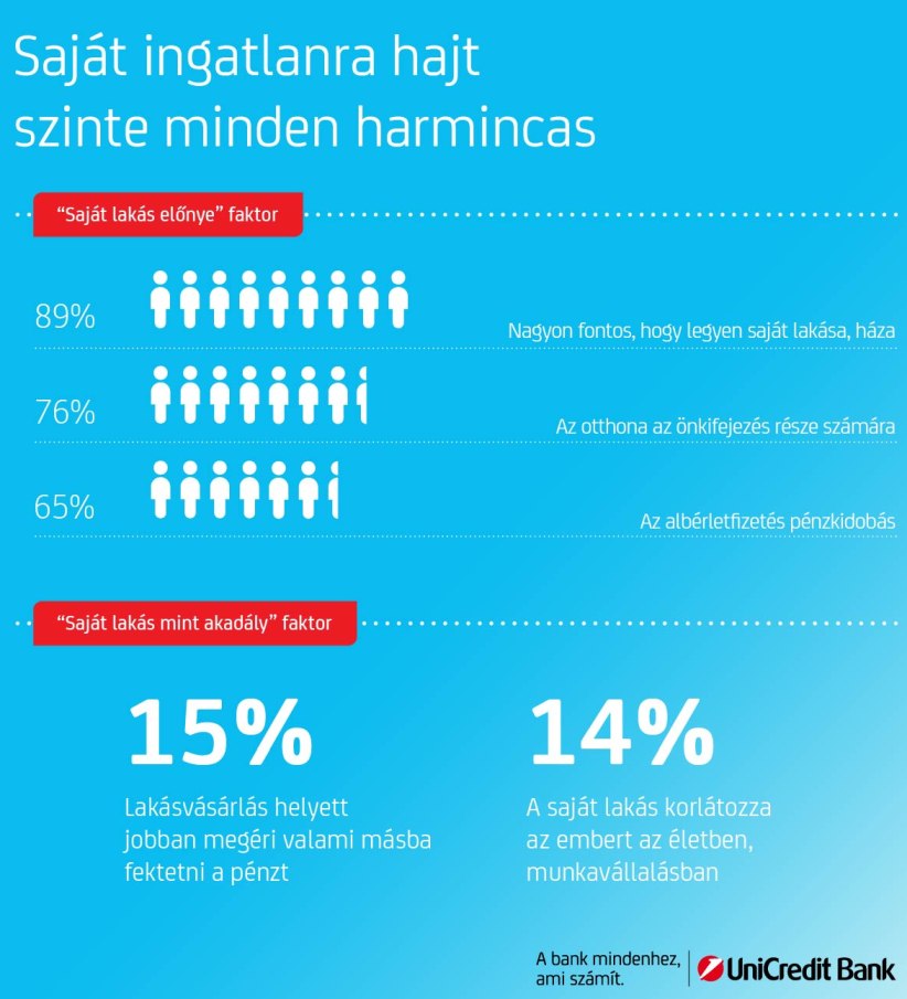 A megkérdezettek 57%-a saját ingatlanban él, és akinek még nincs, azok közül 10-ből 9-en vágynak saját lakásra. A saját ingatlannal rendelkezők aránya magasabb a házas, gyerekes, teljes állásban dolgozó, szellemi munkát végző, diplomás harmincasok körében. Ők önkifejezésük részeként tekintenek az ingatlanra, és anyagilag kedvezőbbnek tartják az albérlettel szemben.