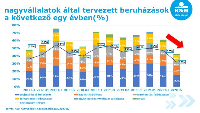 A KSH augusztusban közzétett adatai szerint 2020 II. negyedévében tovább csökkentek a nemzetgazdasági beruházások, mivel 9,9 százalékkal maradtak el az előző év azonos időszakához képest. A visszafogott beruházási tevékenység pedig a nagyvállalatok tervezett fejlesztései alapján még jó darabig folytatódhat. „A K&H nagyvállalati növekedési index legutóbbi adatai alapján az eddigi tendenciához képest komoly változás állt be a hazai, 2 milliárd forint feletti éves árbevételű, nem-állami nagyvállalatok beruházási szándékában. A válság következtében óvatosak és megfontoltak lettek a hazai nagyvállalatok, amit jól mutat, hogy míg az előző negyedévben a válaszadók 47 százaléka tervezett fejlesztéseket, addig jelenleg 15 százalékponttal kevesebben, a cégek alig harmada (32 százalék) vélekedik ugyanígy. A visszaesés az előző évekhez képest is jelentősnek mondható, hiszen hasonlóan alacsony érték utoljára 2017. harmadik negyedévében jellemezte a nagyvállalatok beruházási aktivitását. A fejlesztési célokat tekintve nem látható lényeges változás, hiszen a korábbi évekhez hasonlóan most is a technológiai beruházások a legnépszerűbbek. Az előző negyedévhez képest azonban jelentősen, 27 százalékról 15 százalékra mérséklődött az ebben gondolkodók aránya” – ismertette az eredményeket Patrick Van Overloop, a K&H üzleti ügyfelek divízió vezetője.