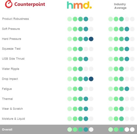 Tarun Pathak, a Counterpoint társigazgatója a gyártás minőségének eredményeit kommentálva a következőket mondta: „Az összeszerelés minőségét több szempont alapján értékeltük, beleértve a termék robusztusságát, erő behatási-, leesési-, anyag fáradási-, kopás- és karcolódás-, hőbehatás-, nedvesség- és folyadékteszteket. A tesztek kvalitatív és kvantitatív megfigyeléseket egyaránt tartalmaztak. Megállapítottuk, hogy a Nokia telefonok az iparági átlagnál szigorúbb teszteken mennek keresztül. Ezért arra a következtetésre jutottunk, hogy ha ezeket is figyelembe vesszük a gyorsabb szoftverek és biztonsági frissítések mellett, akkor az erős gyártási minőség azt jelenti, hogy a Nokia telefonok ki fogják bírni az idő próbáját, ami egyre fontosabb azokban az időben, amikor globálisan az eszközcserék ciklusai egyre hosszabbak, megközelítik a 30 hónapot. ”