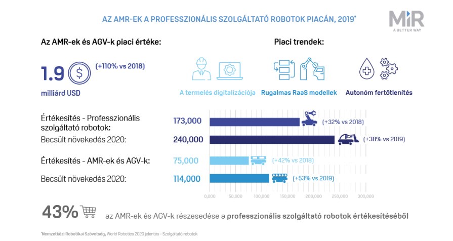 A Nemzetközi Robotikai Szövetség (IFR) 2020-as globális robotikai jelentésének szolgáltató robotokkal foglalkozó fejezete 1 szerint, 2019 végén a logisztikai robotok eladási értéke 1,9 milliárd amerikai dollár volt. Vállalatok és szervezetek világszerte 75 ezer AMR és AGV rendszert vásároltak, ami 42%-kal magasabb érték az előző év adataihoz képest. Az IFR becslése szerint a szegmens értékesítésének növekedése 2020-ban is hasonló eredményt fog mutatni. A piacra ható legfőbb trendek a gyártás digitalizálása, a rugalmas RaaS modellek (azaz „robot, mint szolgáltatás”), illetve az autonóm fertőtlenítés iránt mutatott érdeklődés.