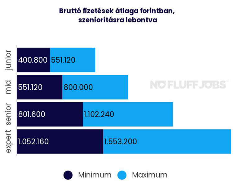 A No Fluff Jobs különlegessége, hogy az álláshirdetésekben publikusak a fizetési sávok. Ez a magyar piacon meglehetősen ritka, de a jelentkezők számára átláthatóbbá és vonzóbbá teszik az ajánlatokat. Ennek köszönhetően a bruttó fizetések átlagát is megállapították szenioritási szintekre bontva. A junior pozícióba jelentkezők bruttó 400 és 550 ezer között kereshetnek, a mid szenioritású fejlesztők 550 ezer és 800 ezer közötti fizetéssel számolhatnak, a seniorok 800 ezer és 1,1 millió közöttivel, az expertek pedig akár 1,5 milliót is hazavihetnek havonta.