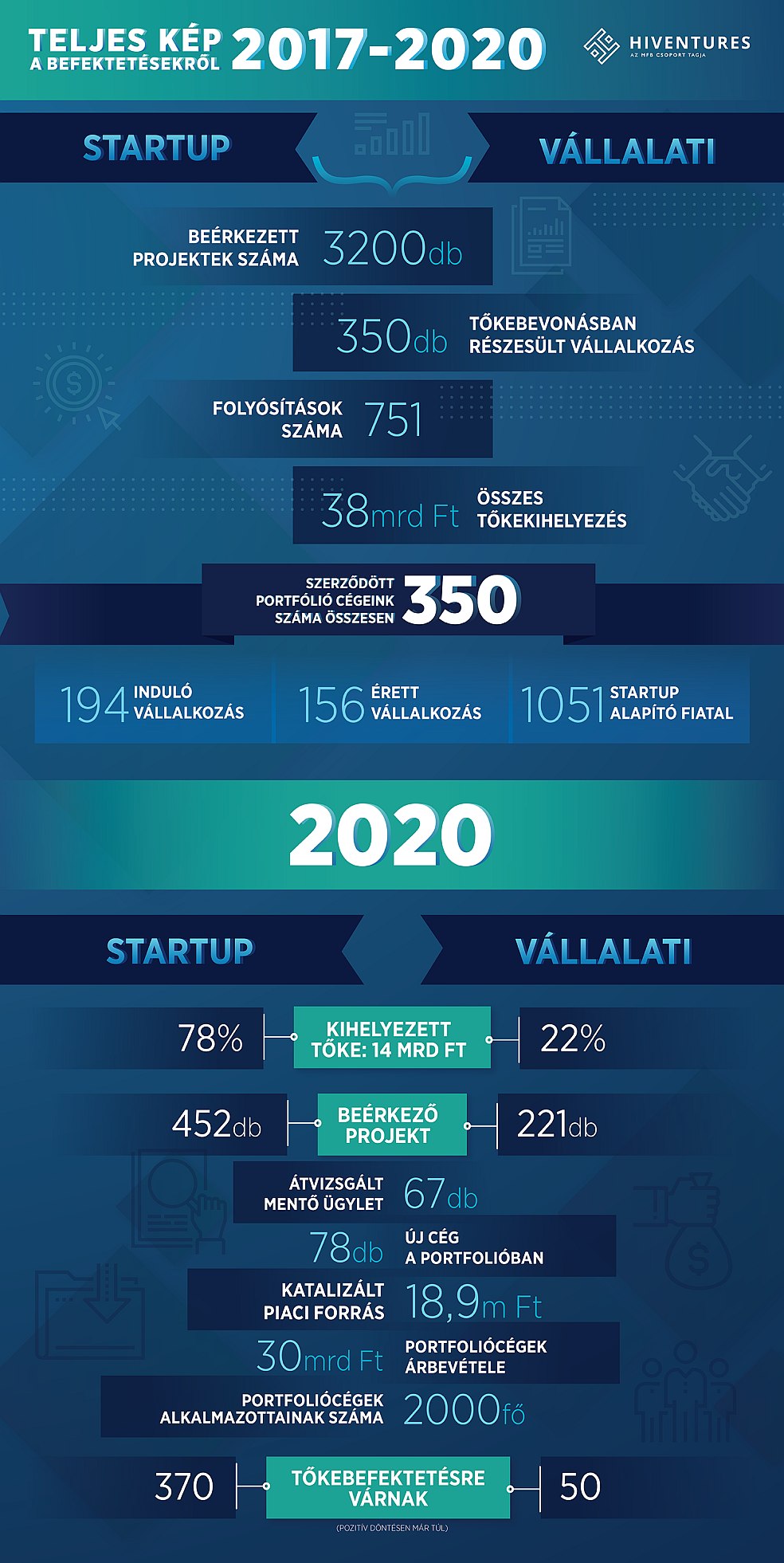 Európa egyik legaktívabb befektetőjeként az MFB Csoporthoz tartozó Hiventures 2020-ban közel 14 milliárd forint tőkekihelyezést valósított meg, ezzel fennállásának négy éve alatt összesen 38 milliárd forintot folyósított. Portfoliójában mára 350 cég található. A tőkebevonásban részesült társaságok a tavalyi évben a krízishelyzet ellenére is jól teljesítettek, mintegy 30 milliárd forint árbevételt termeltek és közel 2000 főnek biztosítanak munkahelyet.