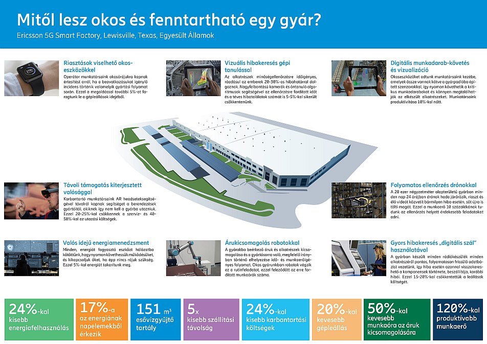 A hálózati eszközöket gyártó Ericsson USA 5G Smart Factory dolgozói 25 úttörő technológia alkalmazásával 120 százalékkal nagyobb kibocsátásra képesek, mintha egy hagyományos üzemben dolgoznának – és mindemellett a gyártás ökológiai lábnyoma is sokkal kisebb. Az Ericsson nemcsak saját gyárában alkalmazza ezeket a megoldásokat, hanem ipari ügyfelei számára is értékesíti.