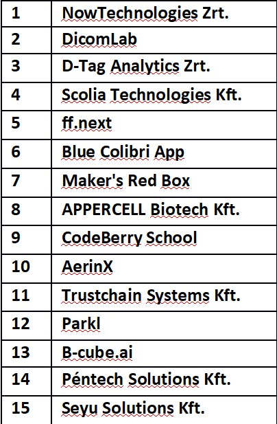A Top 15 Scale-up listára olyan, már jól ismert, cégek kerültek be, akiknek növekedési pályáját az elmúlt években jól nyomon követhettük. A TOP15 Scale-up rangsor első helyezettje ezúttal a Bitrise lett, megelőzve az Omixon Biocomputing, és a Starschema szintén dobogós vállalkozásokat. A negyedik helyet a SEON Technologies az ötödiket pedig a BitNinja szerezte meg. Az ő esetükben már komoly sikereket ünnepelhetünk, egyben ösztönző példát állítanak a még korábbi szakaszban járó pályatársaiknak. Teljes lista itt: