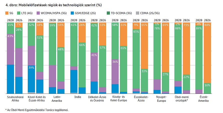 Az 5G elterjedésének üteme nem egyenletesen oszlik meg a világban. A legtöbb 5G előfizetés Ázsiában van (190 millió), ebből csak Kínában 173 millió, de Dél-Koreában és Japánban is dinamikus a növekedés. Ugyanígy Észak-Amerikában, azon belül is leginkább az Egyesült Államokban, ahol 14 millió 5G előfizetőt számoltak 2020 végén. Európában ezzel szemben – elsősorban a több országban is elhalasztott frekvenciatender döntések miatt – a teljes kontinensen mindössze 8 millió 5G előfizetésről tudunk, és a növekedés üteme is lassabb. Az 5G aránya az összes előfizetésen belül itt mindössze 1%, amiben nemcsak Kelet-Ázsia (9%) és Észak-Amerika (4%), hanem az Öböl-menti államok (2%) is előrébb járnak.