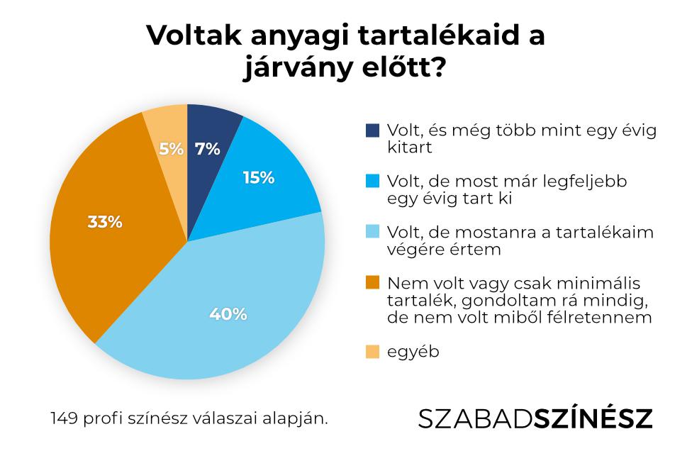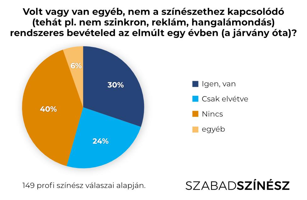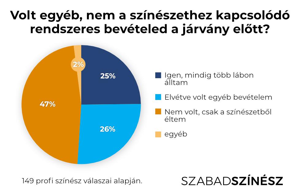 A válaszok alapján a járvány előtt a színészek majdnem felének (47 százalék) nem volt más bevétele, mint a színészet; ez az arány némileg javult a járvány alatt, de látszik, a többség még kivárt, nem vállalt más munkát, hátha visszatérhet a színészethez, mint fő bevételi forráshoz.