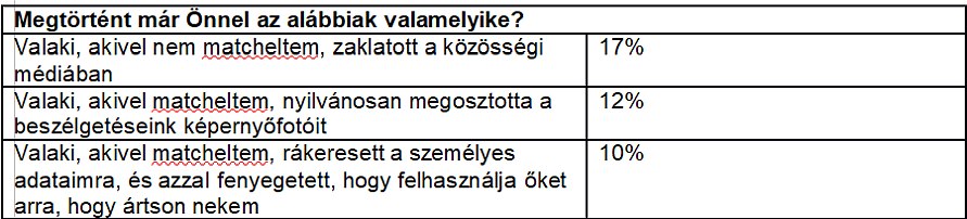 A kutatás az online társkeresés során a felhasználókra leselkedő adatvédelmi fenyegetéseket is részletesebben ismerteti. A megkérdezettek 40%-a arról számolt be, hogy az online beszélgetés során a partnere a belegyezése nélkül osztott meg képernyőfotót a beszélgetésükről, online fellelt személyes információkkal fenyegette őt, kiszivárogtatta az intim fotóit, vagy a való életben zaklatta őt, ami ugyancsak a doxolás egyenes következménye. A legelterjedtebb probléma azonban a kiberzaklatás – a válaszadók 17%-a mondta azt, hogy zaklatta őt a közösségi médiában egy olyan személy, akivel nem matcheltek.