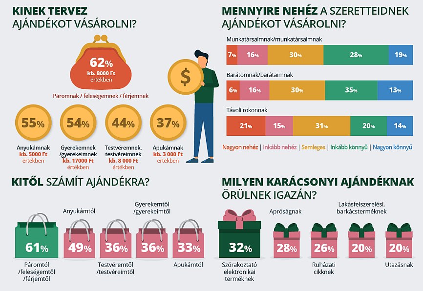 Tavaly átlagosan 52 300 Ft volt az ajándékokra szánt keret, idén ez az összeg már meghaladja a 60 ezer forintot (60 411 Ft), ami átlagosan 15,5%-os növekedést jelent. A karácsonyi ajándékokra szánt kiadás az egy háztartásra vetített átlagos, nettó, havi jövedelem – akár– 17%-át is jelentheti. Ráadásul a több mint 60 ezer forintos keret közel 28%-át a gyerekek ajándékaira szánjuk.