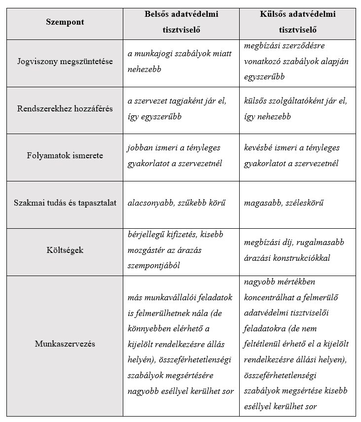 Az adatkezelő, illetve az adatfeldolgozó jogosult mind belsős, mind külsős személyt kinevezni adatvédelmi tisztviselőként. Az alábbi táblázat felsorol néhány szempontot, amelyek kapcsán a felhozhatók érvek a belsős, illetve a külsős adatvédelmi tisztviselő személye kapcsán (természetesen egy adott adatkezelőnél, vagy adatfeldolgozónál felmerülhetnek sajátos körülmények is, a lentiek csupán általános tényezők, megállapítások):