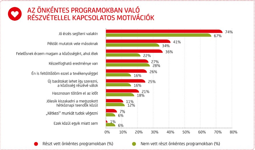 A válaszolók 68 százaléka nyilatkozott úgy, hogy azért vesznek részt adományozási akciókban, mert jó érzés segíteni másokon. A résztvevők számára fontos a tevékenység okán érzett öröm, lelkiismereti megelégedettség és akár új barátok szerzése.