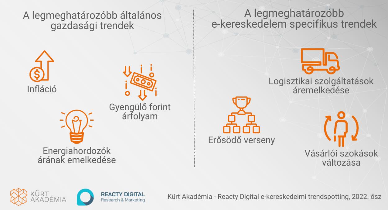 A kérdőív válaszadói értékelték a fontosabb gazdasági trendeket az alapján, hogy azok mennyire meghatározóak a hazai e-kereskedelemre nézve 2022 őszén. Véleményük szerint az infláció, valamint a gyengülő forint árfolyam hatása (lesz) érzékelhető legjobban, az üzemanyag és az energiahordozók árának emelkedése pedig szintén nagy jelentőséggel bír. A mindezekből is adódóan várható hazai vásárlóerő-csökkenést szintén sokan tartották meghatározónak. Spontán említésben előkerültek még olyan trendek, mint a nehezebb általános vállalkozási környezet, az egyre ár-érzékenyebb és kevésbé hűséges vevők, valamint a másodlagos piac (pl. használt termékek) felé való fordulás lehetősége, amikről egyesek úgy érzik, meghatározó kérdések lesznek az elkövetkező időszakban.
