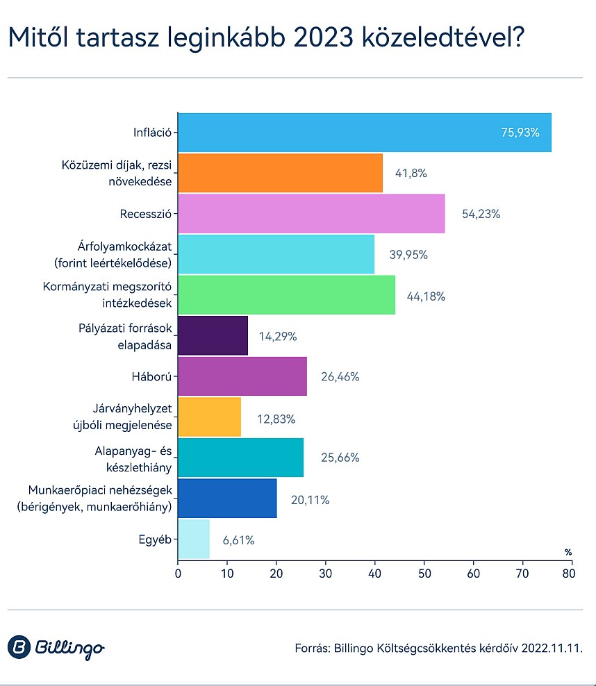 Nem nagy meglepetés, hogy az előttünk álló 2023-as év bizonytalanságaitól tartanak a vállalkozók. Költségcsökkentést, áremelést és akár szervezeti átstrukturálást is terveznek. Most már számokban is látni lehet, hogy ki, mire készül. A több mint 160 ezres vállalkozói felhasználó bázissal rendelkező Billingo online számlázó kutatást végzett ügyfelei közt, amelyből kiderült: az infláció és az recessziós várakozások szele aggasztja leginkább a cégeket. Sokan próbálnak majd megtakarítani, működési költséget csökkenteni, de olyanok is lesznek, akik az előre menekülés fényében több energiát fektetnek majd árbevétel növelésbe új termékek vagy piacok által.