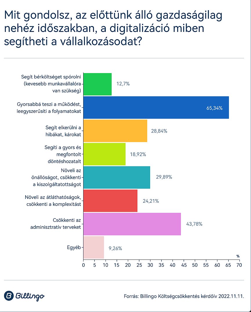 Abban a tekintetben, hogy az előttünk álló gazdaságilag nehéz időszakban a digitalizáció miben segítheti a vállalkozás működését, a válaszadók a gyorsabb működést és az egyszerűbb folyamatokat látják legfontosabb erényének.